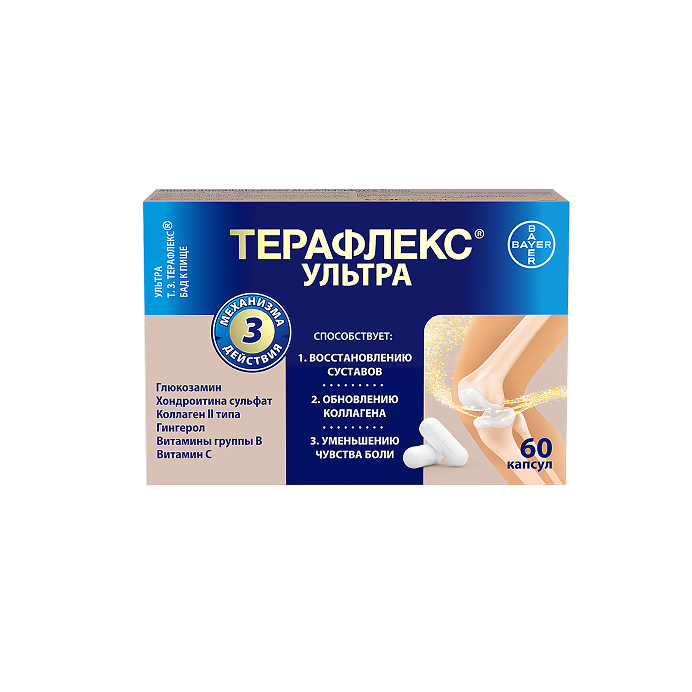 Ультра т.з. Терафлекс® БАД к пище – это комбинация хондропротекторов хондроитина и глюкозамина – важнейших структурных компонентов хрящевой ткани суставов, усиленная следующими ингредиентами: