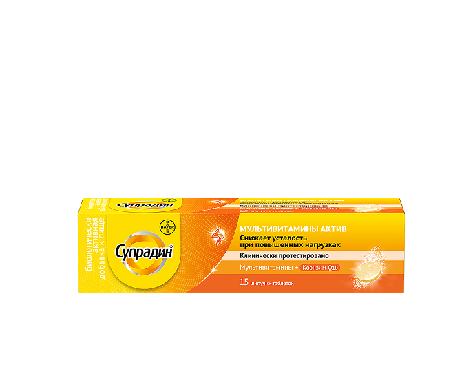 Супрадин Мультидәрумендері Актив –  жоғары жүктемелер кезінде шаршағандықты төмендету және жұмысқа қабілеттілікті қалпына келтіру үшін 13 дәрумен және 11 минералмен, Q10 коэнзимімен байытылған формула. Клиникалық сынақтан өткен.